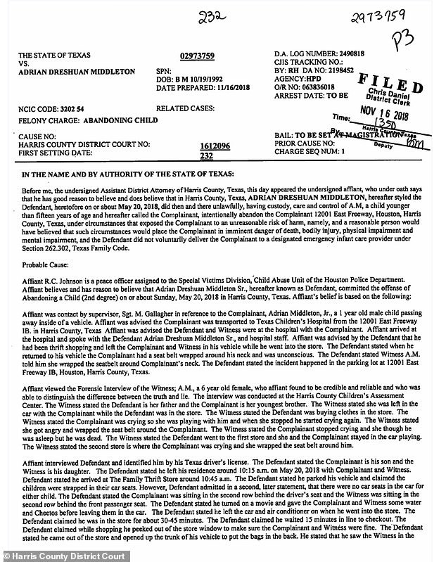 According to court documents filed on Friday, 26-year-old Adrian Dreshaun Middleton from Houston left his two children in his car unattended and went shopping at a store for more than an hour.