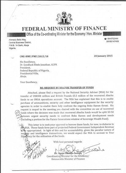 In a bid to exonerate herself from the ongoing controversy surrounding the illegal arms deal by former National Security Adviser, Sambo Dasuki, ex-Minister of Finance, Ngozi Okonjo-Iweala has released a memo, which was sent to former President, Goodluck Jonathan, to seek approval for the requested funds.