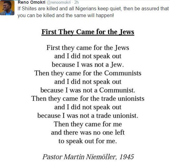 Author and Christian TV host, Reno Omokri, has condemned the silence of christian leaders over the killing of members of the Shiites Muslim sect by the Nigerian army.