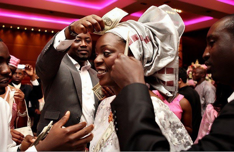 Dancing in a Yoruba marriage is an opportunity for the couple to make some money. The bride and groom usually take to the dance floor while they are circled by friends, family and well-wishers who spray cash on their heads. At the end of the wedding ceremony, the money accrued will be used to settle some minor debts incurred while planning the wedding and cover some expenses like paying for canopies, cake, and drinks among other strange things.