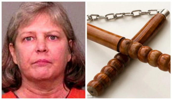 At one point, she grabbed a pair of nunchucks (a traditional martial arts weapon consisting of two sticks connected at one end by a short chain or rope) and began hitting him in the face, neck and hands.