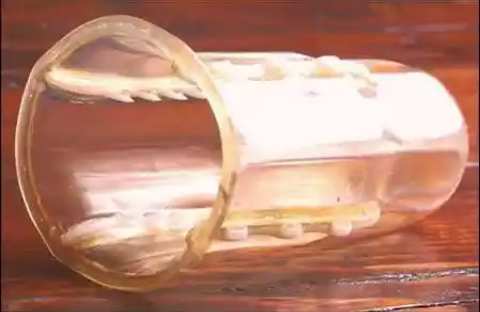 According to Dr. Ehlers, the woman inserts the latex condom like a tampon. Jagged rows of teeth-like hooks line its inside and attach on a man’s penis during penetration.