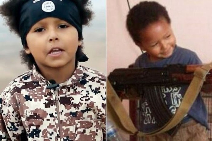 Isa Dare, who was taken to Syria by his Nigeria born mom, Grace “Khadija” Dare, is seen with a young man who addressed the United Kingdom with a scarf covering his face.