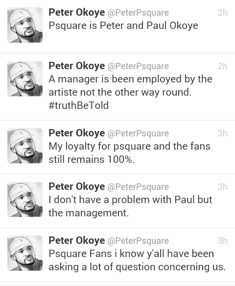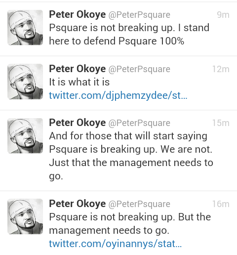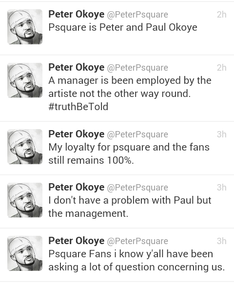 One half of African super pop duo, PSquare, Peter Okoye has taken to Twitter to fire his brother, Jude Okoye of Northside Entertainment as manager of the group.