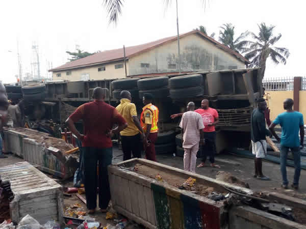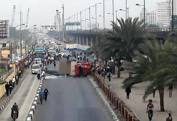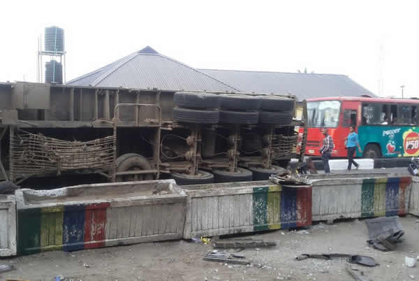 A truck with registration number Lagos BDG 544 XL conveying iron rods Thursday morning crashed at the outer axis of CMS bus stop, blocked the expressway and caused traffic gridlock stretching up to Eko bridge and its environs.