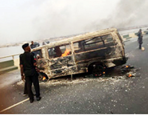 A middle-aged driver was yesterday burnt to death when his bus caught fire on the Third Mainland Bridge.