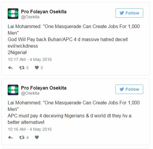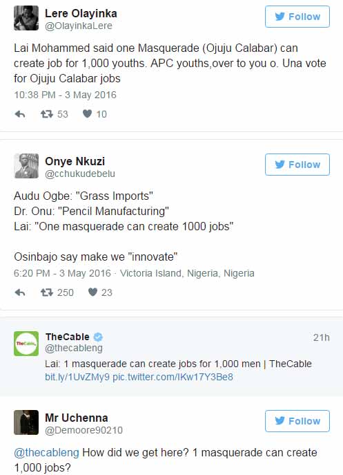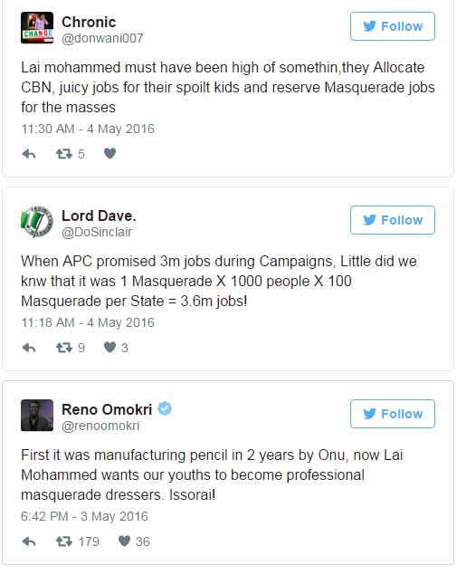 Minister of information and Culture Lai Mohammed, says dressing masquerades could create a thousand jobs per week for Nigerian men.