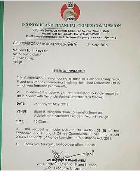 The Economic and Financial Crimes Commission (EFCC) has officially sent an invitation letter to the former minister of aviation, Femi Fani-Kayode.