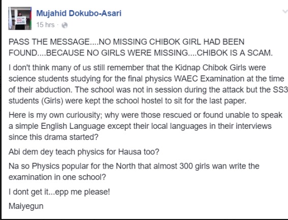 The former Niger Delta warlord, who took to his Facebook Page to express his doubt, insisted that no schoolgirl was kidnapped from Chibok and that the news of girls being rescued is a scam and propaganda.