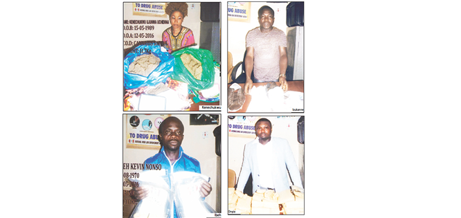 The only female among them, Kenechukwu Uchenna, 27, was arrested on her way to Dubai with 11.7kg of cannabis in dried bitter leaf vegetables.” The commander mentioned other suspects as Agwu Kalu, 30, who was found with 25kg of cannabis in cartons and Okpara Chigozie, 43, caught with 7.500kg of cannabis in his bag. Kalu and Chigozie were both arrested on their way to China. Another suspect, Onyia Clinton, 26, had 16.350kg of cannabis in his luggage during screening of passengers to Doha.