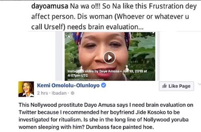 Dayo Amusa unhappy with the perceived insensitivity on Olunloyo’s part came out and said she needed a brain evaluation.