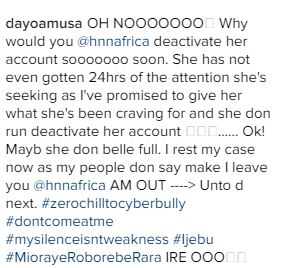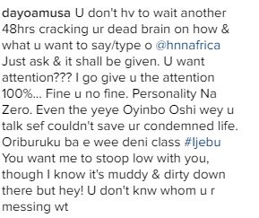 The blogger retorted swiftly calling Dayo Amusa ‘Nollywood prostitute and a dumb-ass painted hoe.’