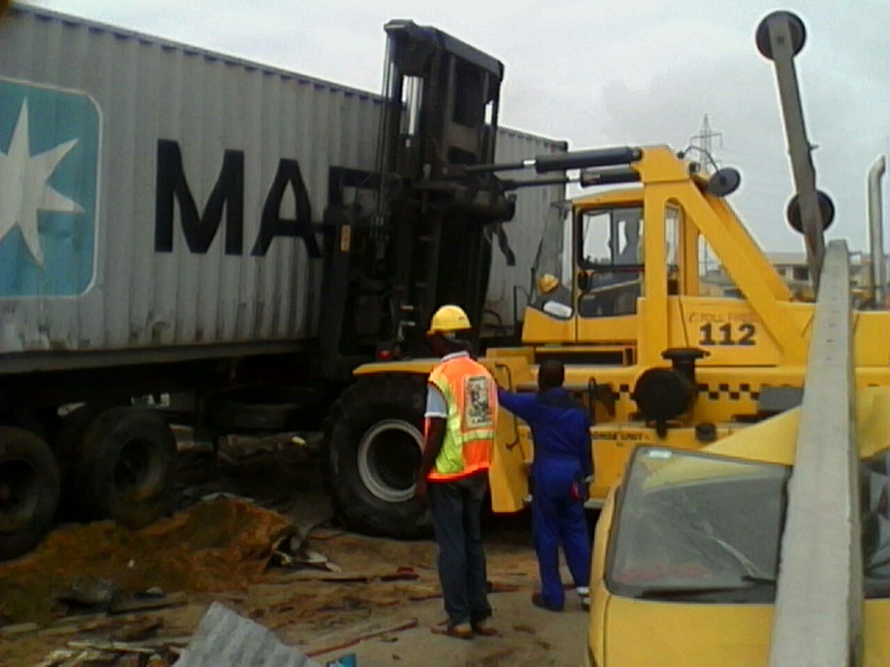 It was gathered that a 40 feet container careying truck moving inward Badagry marked KRD526XP rammed into a commercial bus marked EPE972XH with five occupants.