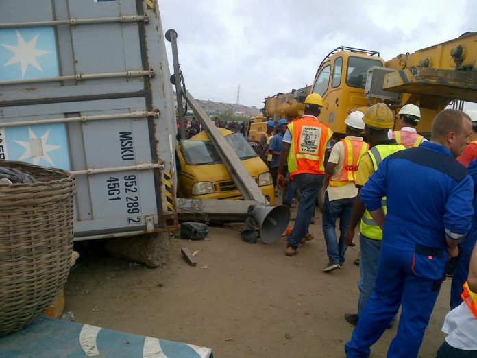 Three persons have been confirmed dead and several two others injured after a container fell on a commercial bus in Lagos.