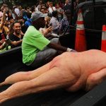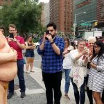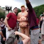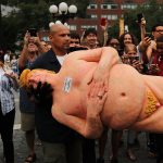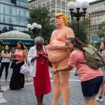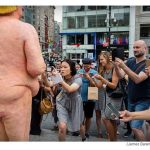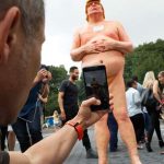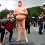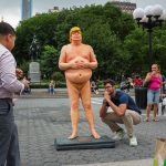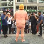 Copies of the orange-tinted likeness – featuring a massive belly, small fingers and missing some genital parts – were simultaneously unveiled in downtown Manhattan’s Union Square Park and public places in four other U.S. cities.