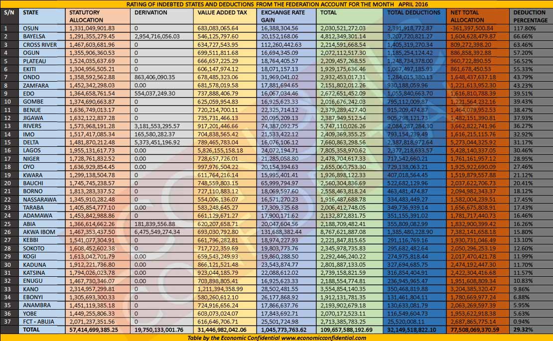 In a report by the Economic Confidential, the economic intelligence magazine, it appears Osun state is worse hit by the development and ranks number one, as its allocation for the month of April 2016 totaling N2.030 billion was wiped away by a deduction of N2.391 billion leaving a deficit of N361 million to be paid in the subsequent month by the state, and this represents a whopping 117.8 percent of the total allocation due the state from the federation account.