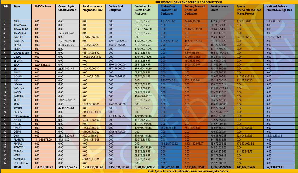 Meanwhile, from the schedule of deductions obtained and computed by the Economic Confidential, the deductions from the states also includes debts on AMCON loan, Commercial Agric Credit Scheme, Bond Issuance Programme, Contractual obligation, and deduction from Excess Crude account. Others are: Refund/Payment arrears of derivation, foreign loans, special intervention/flood management project, the national fadama project and reconstruction of commercial bank loans into FGN bonds apart from bail-out funds.