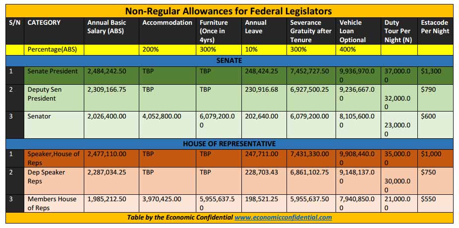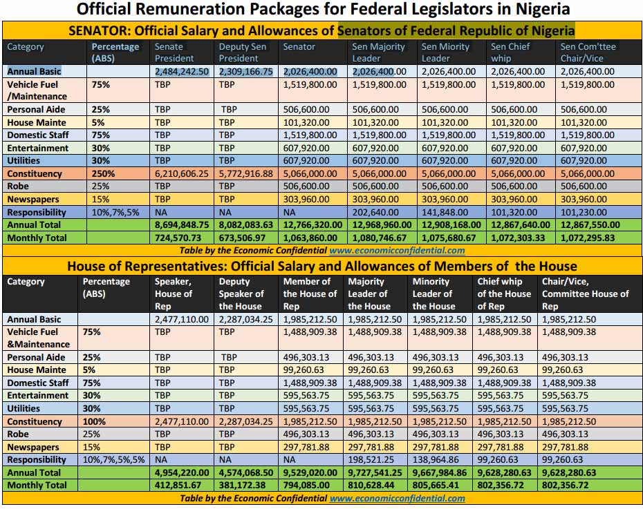 The report obtained by Economic intelligence magazine showed the ‘legitimate’ remuneration of the federal legislators in compliance to the statutory approval of the Revenue Mobilisation, Allocation and Fiscal Commission (RMAFC). The remuneration packages include: annual salaries, accommodation, vehicle maintenance and fuel, Personal Assistants, House maintenance, domestic staff, entertainment and utilities allowances. Others allowances are; Constituency allowance, Annual Leave, Hardship allowance, wardrobe, newspapers and responsibility allowances.