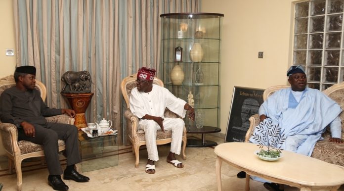 L-R: Vice President, Prof. Yemi Osinbajo; APC National Leader, Asiwaju Bola Tinubu and Lagos State Governor, Mr. Akinwunmi Ambode during the Eid-El-Kabir celebration at Tinubu’s Bourdillon residence in Lagos.