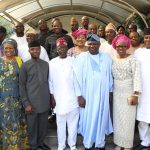 L-R: Lagos State Governor, Mr. Akinwunmi Ambode (4th right); his Wife, Bolanle (3rd right); APC National Leader, Asiwaju Bola Tinubu (4th left); Vice President, Prof. Yemi Osinbajo (3rd left); Senator Oluremi Tinubu (2nd left); member, House of Representatives, Ikeja Federal Constituency; Hon. James Faleke; Commissioner for Special Duties & Inter-Governmental Relations, Mr. Oluseye Oladejo; APC Gubernatorial Candidate in Edo State, Mr. Godwin Obaseki (left behind) and others during the Eid-El-Kabir celebration at Tinubu’s Bourdillon residence in Lagos on Monday.