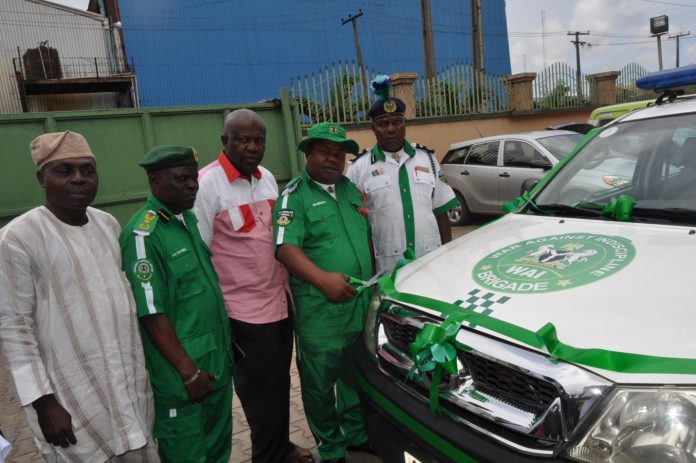 Representative of the State Director of Nigeria Orientation Agency, Mr Wole Bamiro; Deputy National Commander, WAI Brigade Nigeria, Alhaji Jimoh Yakubu; Managing Director Pharmatex Industries, Chief Christopher Nebe; The Donor & Executive Director, Pharmatex Industries, Chief Joseph Ebowusim, and the WAI Brigade Lagos State Commander, Senior Comrade Gabriel Adeoye, at the official presentation of an operational vehicle to WAI Brigade by the State Patron, in Lagos recently.