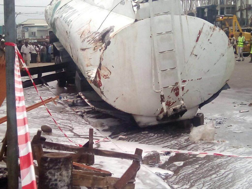 Fuel tanker falls on car, kills one in Lagos [PHOTOS]
