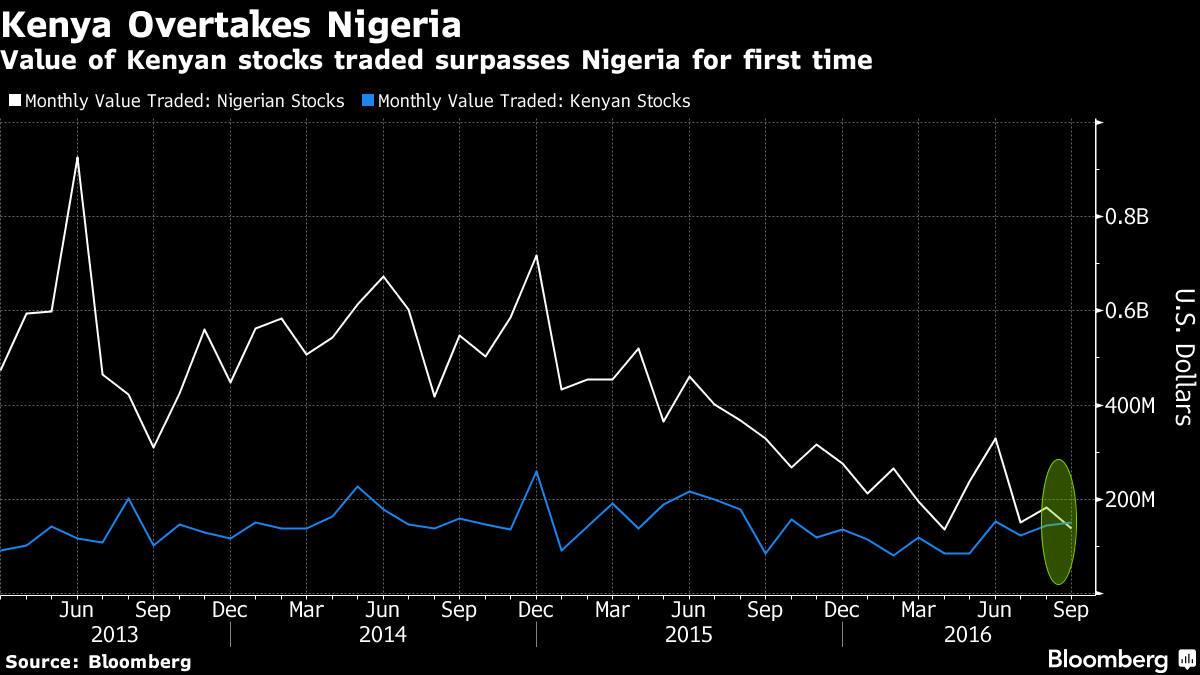 “Investors put more money into Kenyan stocks than Nigeria’s for the first time on record in September. The value of shares traded on Nigeria’s exchange fell to $139 million, near the lowest since Bloomberg began compiling such data in 2009, as foreign investors shunned an economy battered by militant attacks on oil facilities and shortages of foreign-exchange,” Bloomberg reported with the chart below.