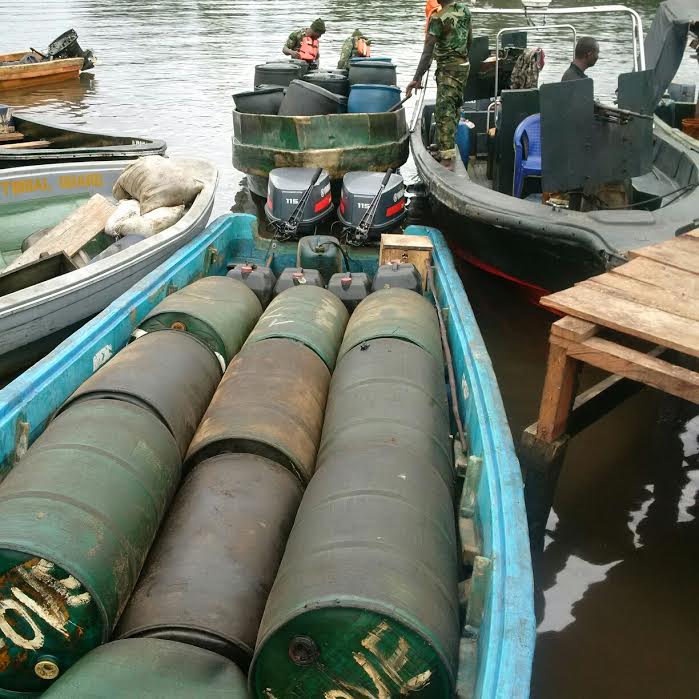 Meanwhile, a patrol team deployed by NNS PATHFINDER has raided Adokiakiri Creek around Okirika axis and Dutch Island at Onne in Rivers State. During the operation, the Team arrested 8 suspects and destroyed 4 speedboats laden with 100 MT of illegally refined AGO. Two barges containing 500MT of suspected stolen crude oil were also destroyed by the team. In another raid, the Patrol Team also arrested 3 suspects onboard MV OMETE VI and a large wooden barge laden with about 120MT of illegally refined AGO around FOT Onne in Rivers State.