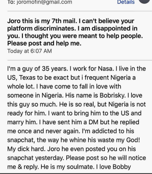 The yet ­to ­be­ named lover introduced his email by expressing anger at Olumofin for not linking him up with Bobrisky despite sending about six emails on the request alone.