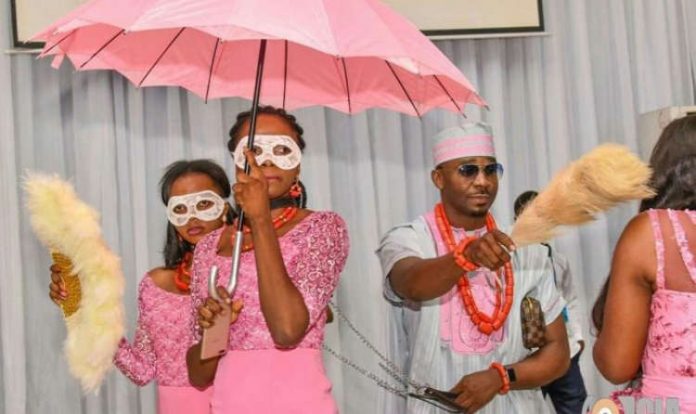 In the pictures, he was seen putting leash on young girls and leading them to a wedding in Lagos.