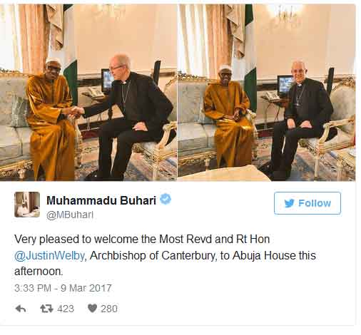 “Very pleased to welcome the Most Revd and Rt Hon @JustinWelby, Archbishop of Canterbury, to Abuja House this afternoon,” he said on Twitter.
