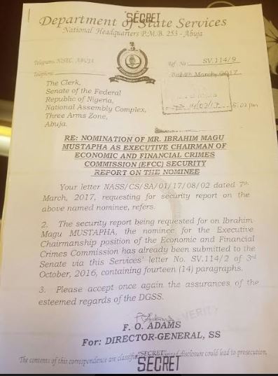 After Magu’s re-nomination, the senate, on March 7, wrote to the DSS for another security report on him.