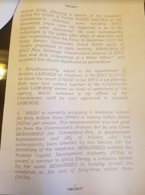“Magu is currently occupying a residence rented for N40m at N20m per annum. This accommodation was not paid [for] from the commission’s finances, but by one Umar Mohammed, air commodore retired, a questionable businessman who has subsequently been arrested by the secret service.
