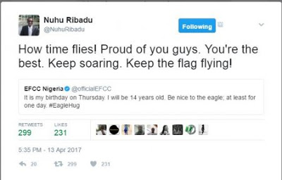 Mr. Ribadu, on his twitter timeline said: “As @officialEFCC celebrates 14 years, it’s time to remember all the sacrifices especially by the unknown foot-soldiers who paid the supreme price”.