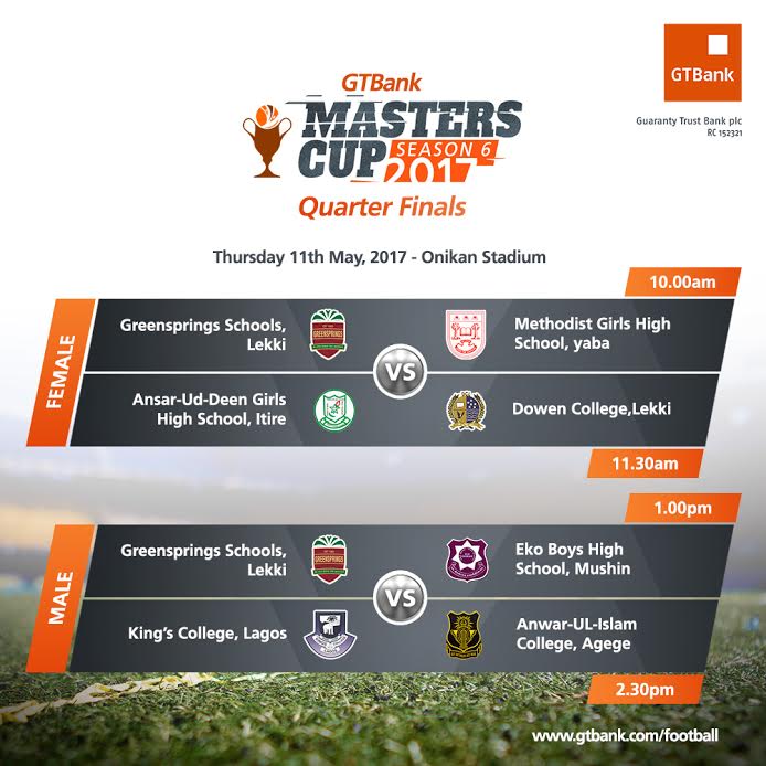 The Quarter-final matches of the 2017 GTBank Masters Cup (Season 6) are set to hold on Thursday the 11th and Friday the 12th of May, 2017 at the Onikan Stadium in Lagos.