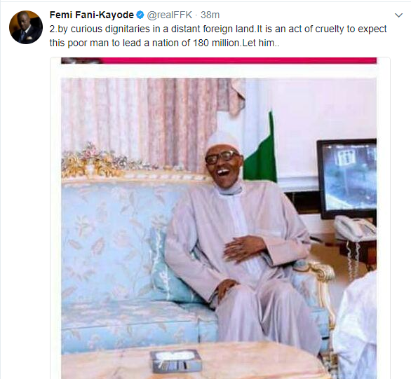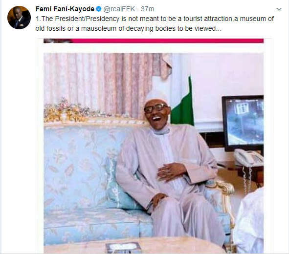 Fani-Kayode, a chieftain of the Peoples Democratic Party, PDP, in a series of tweets via his social media said the presidency was not meant for tourist attraction of a ”mausoleum of decaying bodies.”