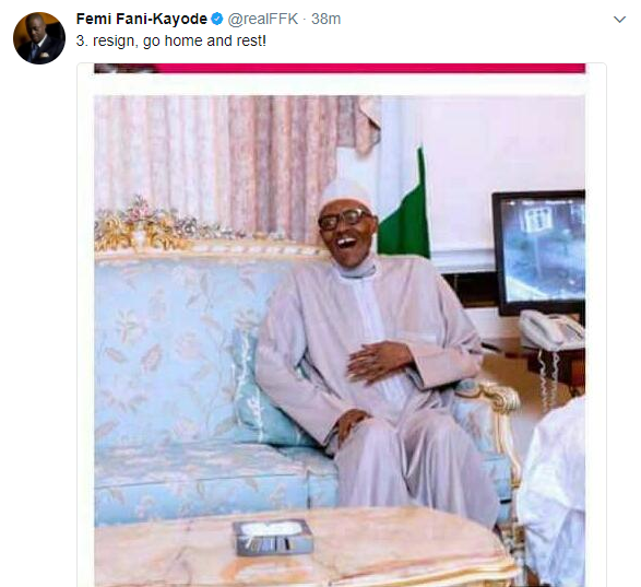 Former Minister of Aviation, Femi Fani-Kayode, on Thursday called on President Muhammadu Buhari to resign.