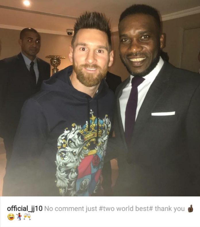 Argentine football star, Lionel Messi “all the way up” with Nigerian football icon, Jay Jay Okocha, as they were pictured at the FIFA Football Awards in London.
