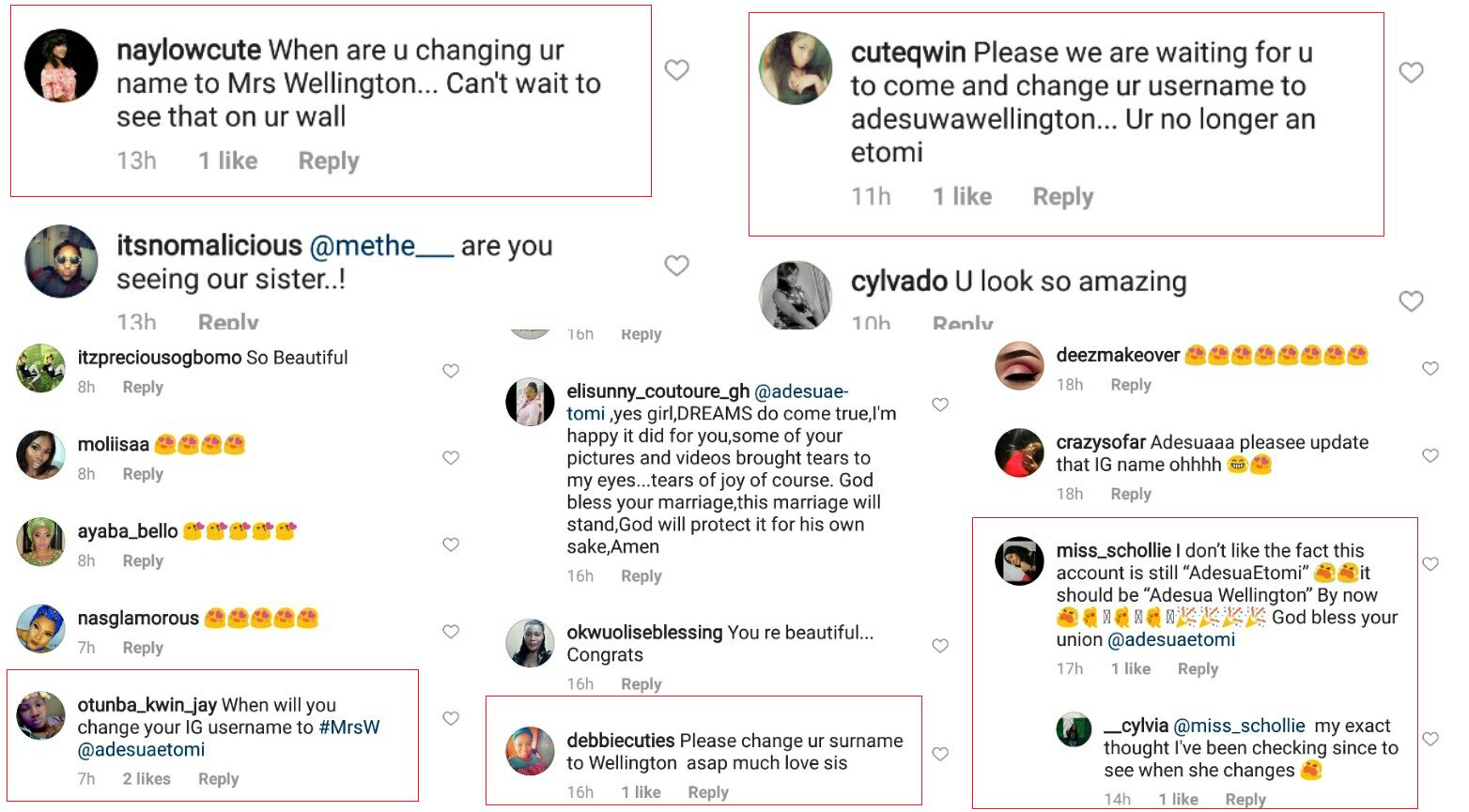 Meanwhile some people are already monitoring what the actress has or hasn’t done on social media. They’ve stormed the comment section of her Instagram page, ‘advicing’ her to include her new surname ‘Mrs Wellignton’ in her profile.