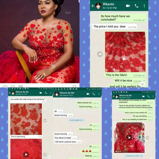“This was too bad. On the 29th of December 2017 which happens to be a day to my wedding, a greedy designer decided to ruin my big day. I cried all day no stop.I bought this lovely fabric from @bshani_bridalfbrics and asked her to deliver to this designer @rikaotobyme after I had concluded the style and price with @rikaotobyme I made a 50% payment to her as soon the fabric got to her.