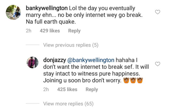 When Banky W responded saying the dayb he gets married, he won’t only break the internet but cause an earthquake ,Don Jazzy replied,saying he doesn’t want the internet to break but just witness pure happiness.