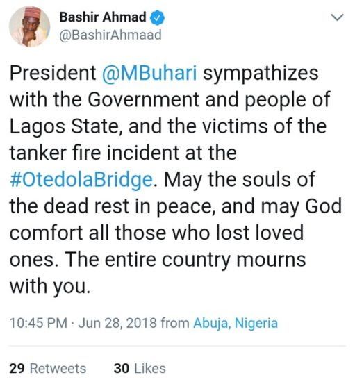 President Buhari who reacted to the incident through a statement issued by his Senior Special Assistant on Media and Publicity, Mallam Garba Shehu, in Abuja, on Thursday, sympathized with the Lagos State Government and the residents of the state.