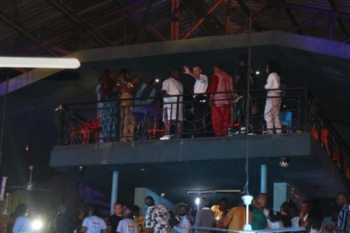 He arrived the night club in a casual white shirt, with sleeves rolled and was seen at the balcony, acknowledging cheers from a large crowd of Nollywood actors, actresses and entertainers.