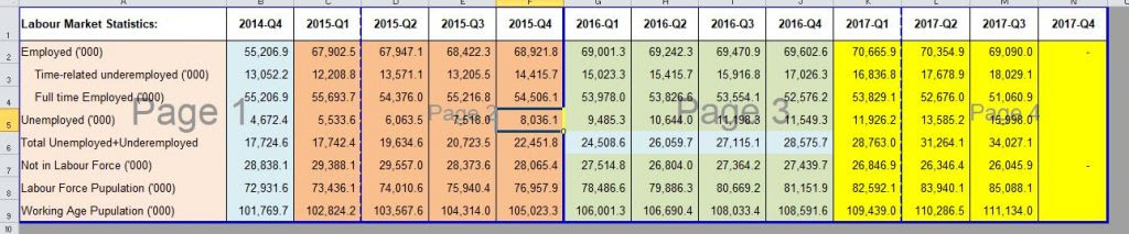 “The labor force population increased from 83.9 million in Q2 2017 to 85.1 million in Q3 2017. The total number of people in full-time employment (at least 40 hours a week) declined from 52.7 million in Q2 2017 to 51.1 million in Q3 2017.”