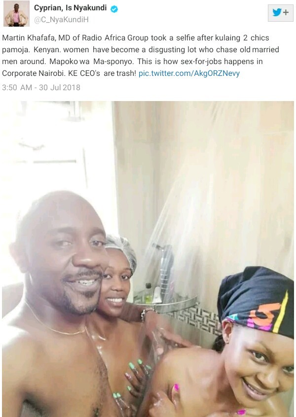 A photo of Martin Khafafa, the Managing Director  of Radio Africa Group, Kenya with two naked ladies in the shower is making the rounds online.