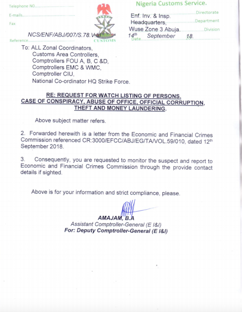“Consequently, you are requested to monitor the subject and report to Economic and Financial Crimes Commission through the provided contact details if sighted,” the customs wrote in a letter dated September 14.