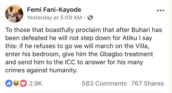 “To those that boastfully proclaim that after Buhari has been defeated he will not step down for Atiku I say this: if he refuses to go we will march on the Villa, enter his bedroom, give him the Gbagbo treatment and send him to the ICC to answer for his many crimes against humanity,” he tweeted.