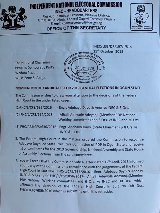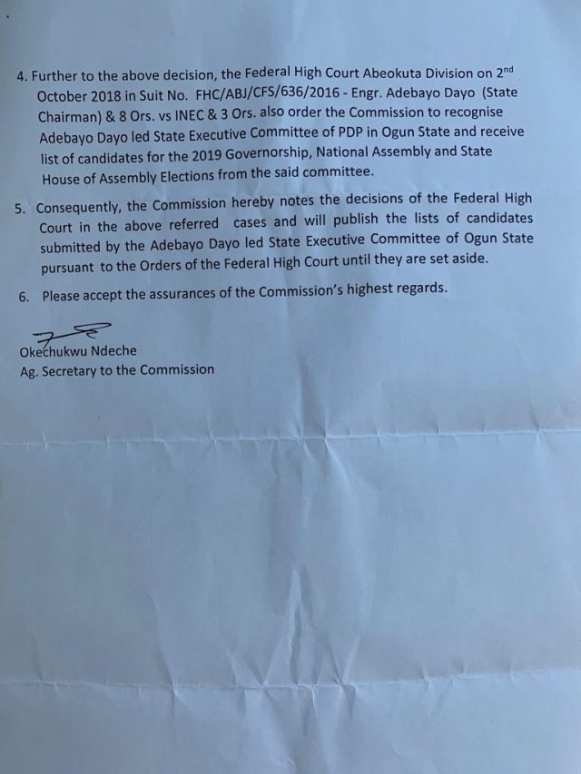 INEC said: “Further to the above decision, the Federal High Court Abeokuta Division on 2nd October 2018 in Suit No. FHC/ABJ/CFS/636/2016 Engr. Adebayo Dayo (State Chairman) 8: 8 Ors. vs iNEC & 3 Ors. also ordered the commission to recognise Adebayo Dayo led state executive committee of PDP in Ogun State and receive list of candidates for the 2019 Governorship, National Assembly and State House of Assembly Elections from the said committee.