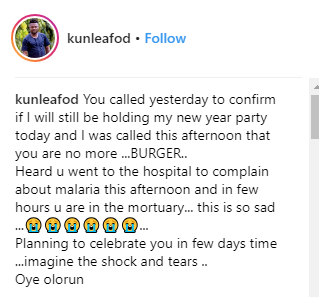 Heard u went to the hospital to complain about malaria this afternoon and in few hours u are in the mortuary… this is so sad ……Planning to celebrate you in few days time …imagine the shock and tears ..Oye olorun” Kunle wrote on his IG page