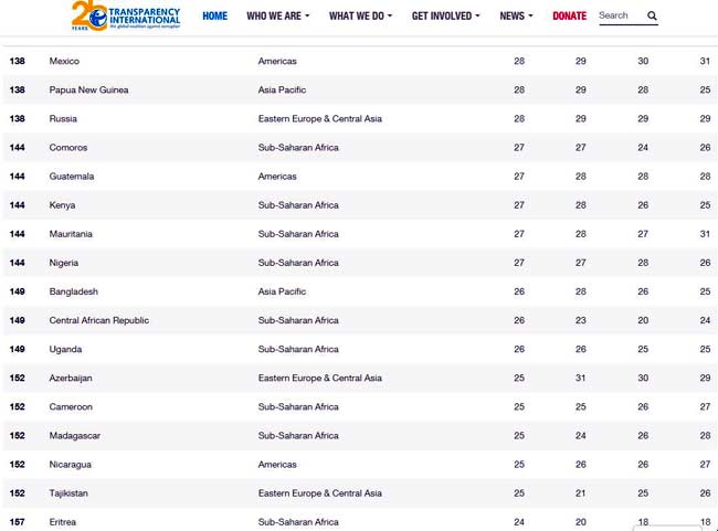 See a screenshot of the index which highlights Nigeria’s position on the CPI below;